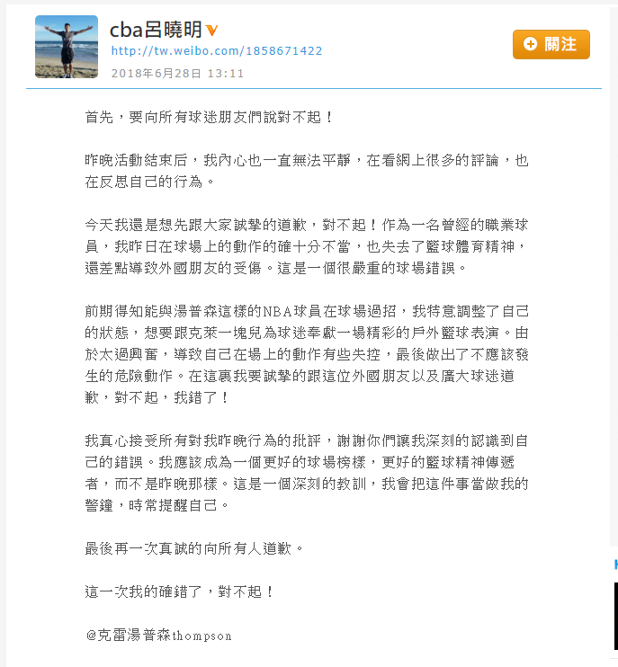 ▼當時湯姆森痛斥呂曉明:「你不能這樣做,這會毀了別人的職業生涯!」說完之後還將手上的水瓶大力摔在地上,接著帶著團隊提早離開了活動現場。不過他在離場前也沒忘記與場內的球迷揮手致意,還跟其中幾位球迷擊了掌才離開。