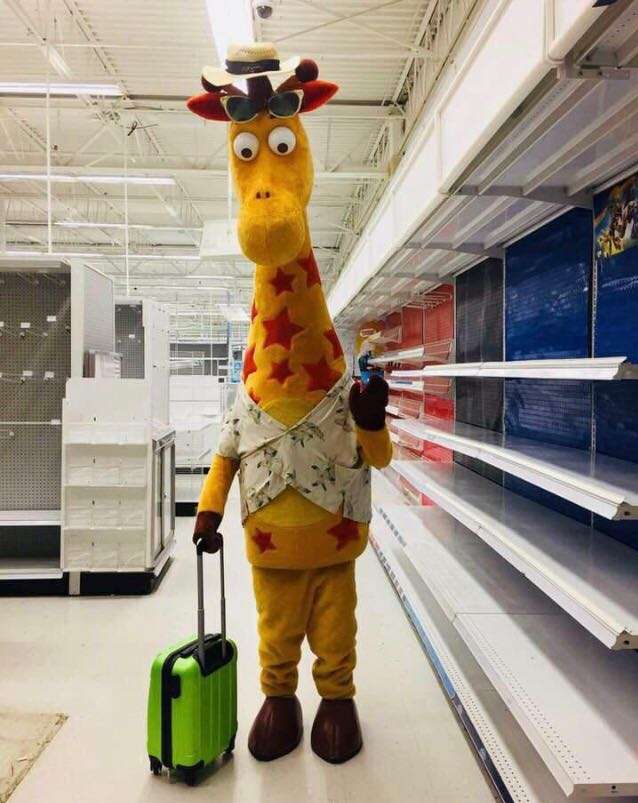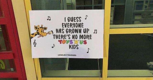 ▼令人神傷的是,有網友貼出了玩具反斗城標誌人物長頸鹿拖著行李箱,離開空蕩蕩店面的落寞身影。還有一張海報寫:「我想每個人都長大了,已經再也沒有玩具反斗城小孩了。」呼應玩具反斗城的經典廣告:「我不想長大,我是玩具反斗城的小孩。」