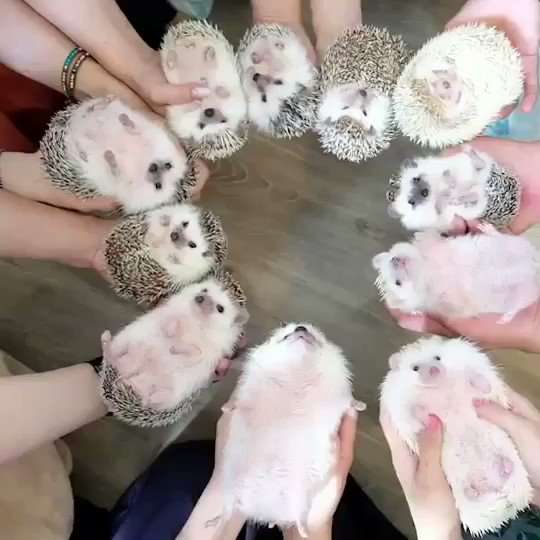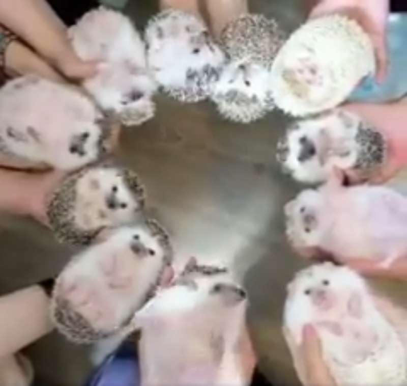 ▼主人們伸手捧著刺猬,將牠們圍成了一個圈。