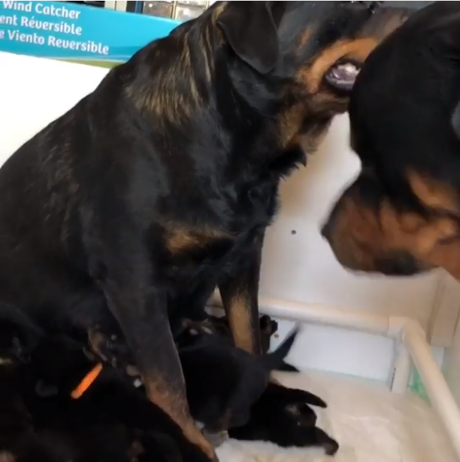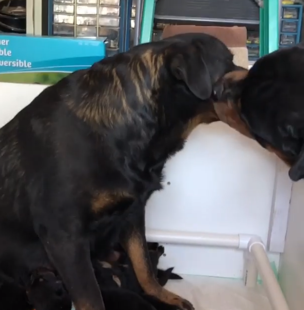 ▼這對位於南加州的羅威那犬夫妻,剛剛迎接他們共同的8位孩子,老公Alex就守護在老婆Siggy旁邊。