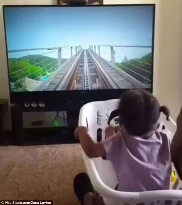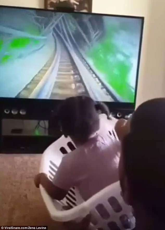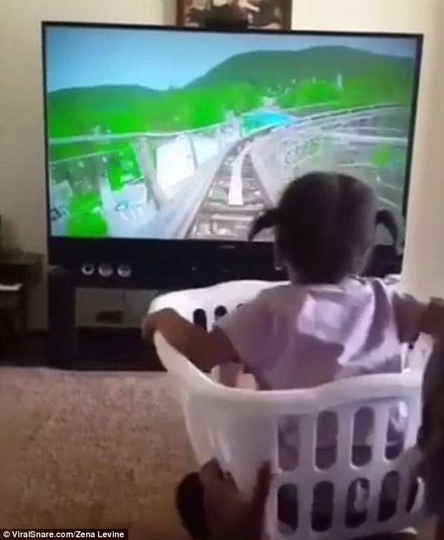 ▼女兒凱拉(Kayla)的年齡太小,還不能去遊樂場坐雲霄飛車,機智的老爸想到一個好主意,他在電視里播放雲霄飛車的影片,然後把洗衣籃放在自己的膝蓋上,讓凱拉坐進來,隨著雲霄飛車軌道的前進,老爸開始模擬爬升、顛簸、加速、下降等場景。
