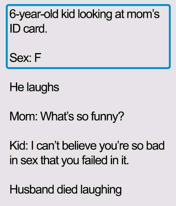 ▼小孩發現了媽媽的身份證,上面的性別寫著:F(Female),讓小孩大笑了起來。