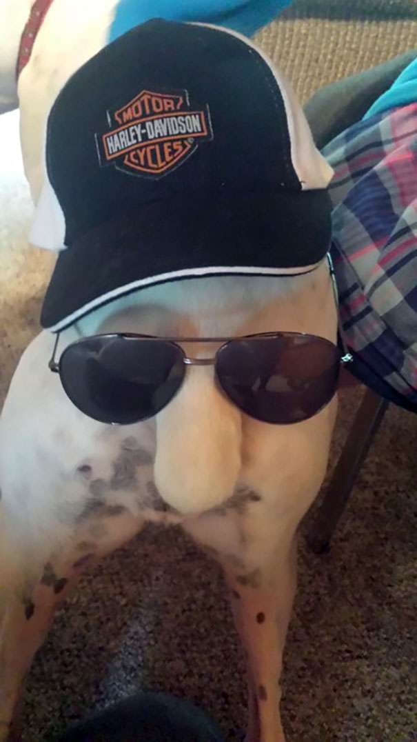 ▼將帽子和墨鏡戴在狗狗屁股上有著意想不到的有趣。