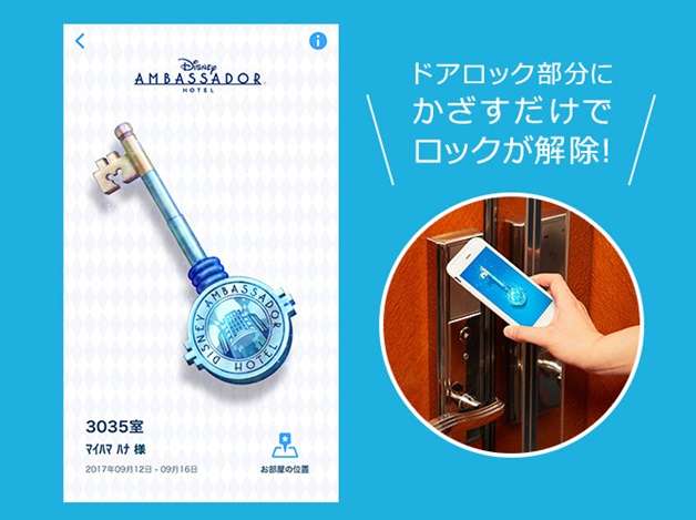 ▼登記入住度假區酒店:迪士尼大使大飯店可以使用手機APP申請辦理線上登記入住服務。只要在東京迪士尼度假區線上預約&購票及東京迪士尼度假區綜合預訂中心成功預訂飯店,在飯店大廳的專用機器前嗶一下手機就可以順利辦理入住手續。手機APP中還有一項強大的功能,就是可以當飯店房間鑰匙來使用。