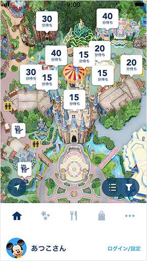 ▼電子導覽地圖:東京迪士尼樂園那麼大,萬一迷路就耽誤時間了。打開手機的GPS定位功能,從APP的地圖上就能查看自己的位置。APP上還有設施、餐廳的等候時間、表演秀的時間表。通過查詢功能,能知道設施是否有快速通關PASS、身高限制等資訊,真的非常方便。