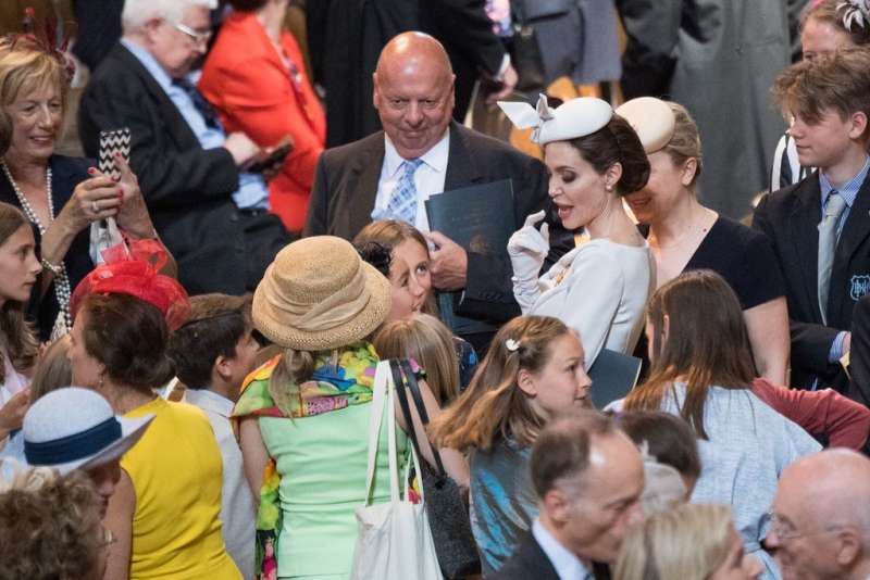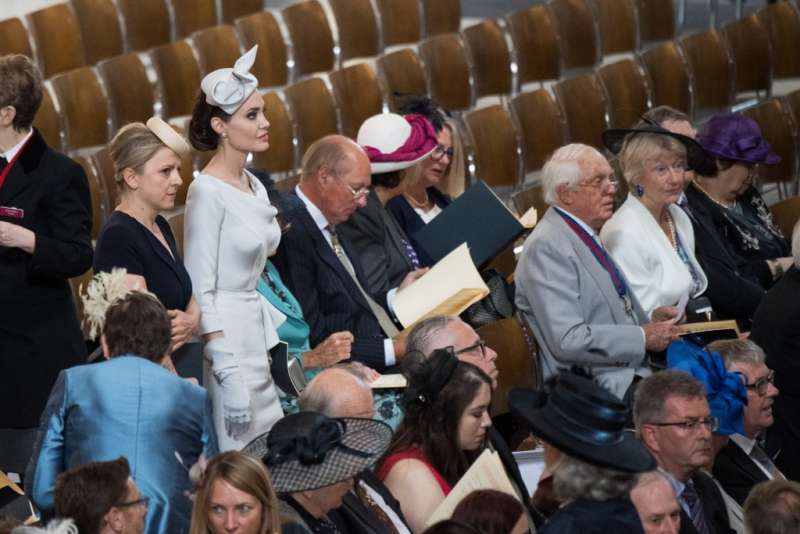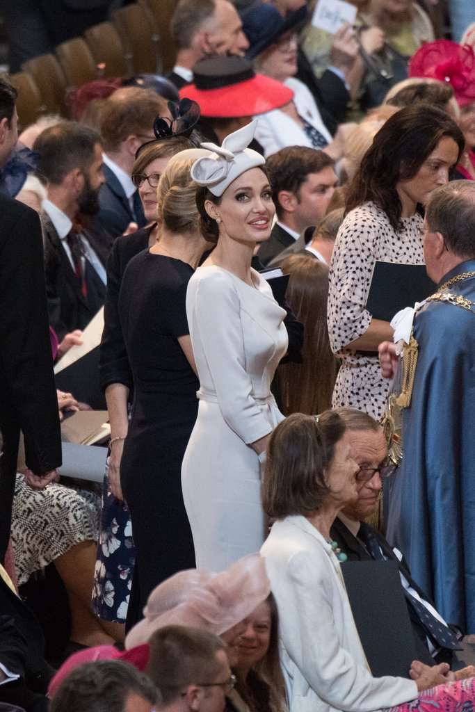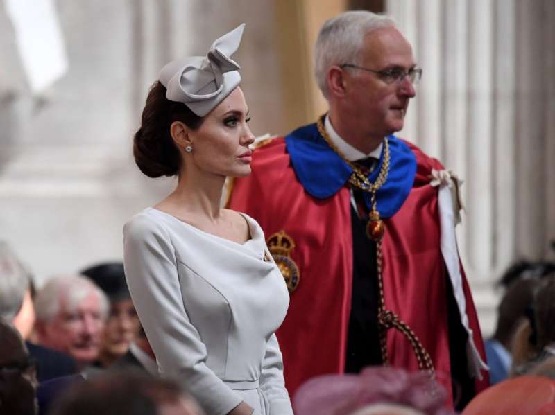 ▼​今年6月,裘莉前往英國聖保羅大教堂,參加聖米迦勒及聖喬治勳章200周年紀念活動。她身穿Ralph&Russo白灰色真絲紗鉛筆裙,戴著長手套,還拿著銀色經典手拿包,看起來霸氣十足,在人群中非常亮眼。