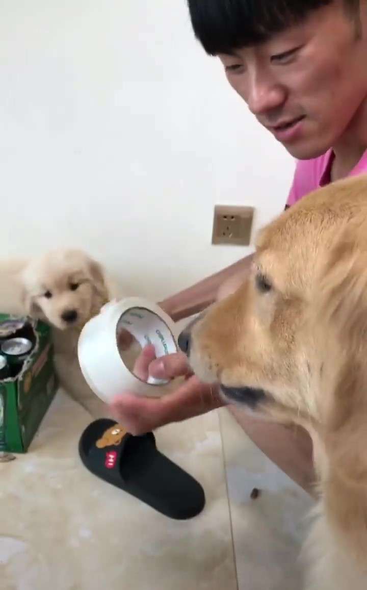 ▼聽完把拔的話,大金金轉身跑到了隔壁房間。正當把拔摸不著頭腦時,牠竟然叼過來一個膠帶。原來這就是牠給把拔的「交代」啊。