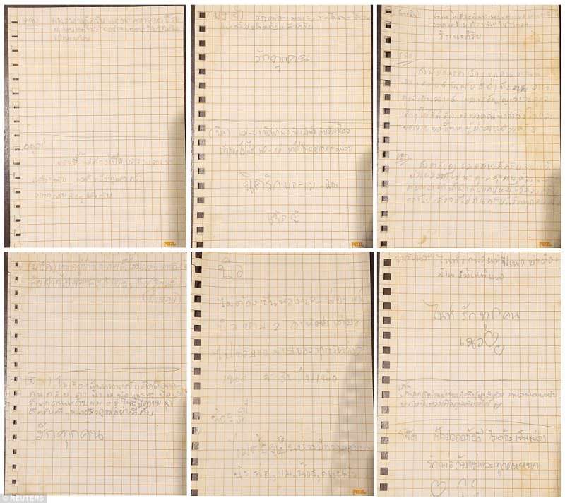 ▼被困期間,少年足球隊成員們拜託潛水員給家人送了幾張紙條,並在紙條上寫了想對外界說的話。其中年齡最小的11歲男孩Titan說:「爸爸媽媽,不用為我擔心,我很好。告訴哥哥等我出去帶我去吃炸雞。」