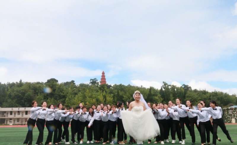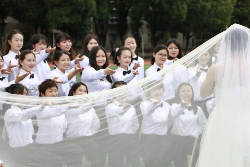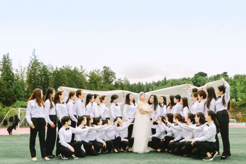 ▼雖然班上沒有其他男同學,但張愷睿的人緣不錯,與女同學們相處得非常好。臨近畢業,他們突發奇想,決定拍攝一組不一樣的畢業照,讓張愷睿穿上婚紗,嫁給班上的女同學們。