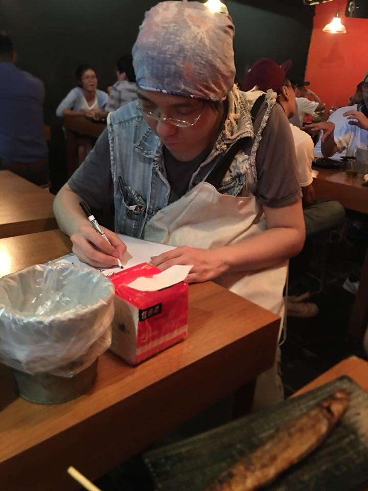 ▼根據原po在《爆廢公社》中的文章表示,當時她與男友在台北市長安東路一家串燒店吃宵夜時發現這名男子的。當時這名男子似乎想開口說些什麼,經過詢問後男子才拿出了一堆畫滿畫的A4紙,用緩慢的速度說道:「我的專長是畫畫,因為媽媽生病要照顧她,所以我想說我最有自信的就是畫畫,希望能靠這個賺點醫療費跟生活費」。
