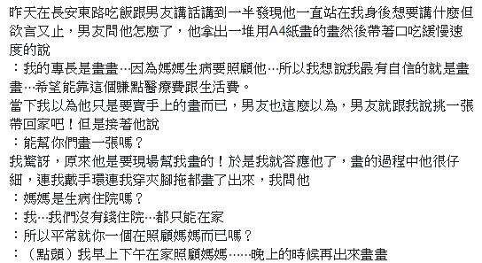 ▼原本原po和男友以為對方只是要出售手上那些畫,正準備挑一張付錢時,男子卻突然詢問:「能幫你們畫一張嗎?」讓原po驚覺原來對方是要現場畫的,於是她也答應了。這名男子在作畫過程也非常仔細,「連我戴手環連我穿夾腳拖都畫了出來」。作畫期間聊天才得知,男子的母親因為生病卻沒有錢住院,目前只能待在家裡。讓男子白天在家裡照顧母親,晚上才出來畫畫賺錢。