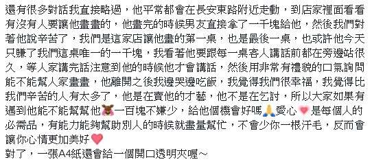 ▼畫完之後原po男友直接付了他1000元,並對他說「辛苦了!」而原po也有感而發的表示對方並不是在乞討,而是在賣自己的才藝,同時呼籲網友如果大家在長安東路一帶的熱炒街遇到對方,可以盡一份力幫忙他。最後也表示他除了畫得很仔細之外,一張A4紙還會再給一個開口的透明夾,非常用心。