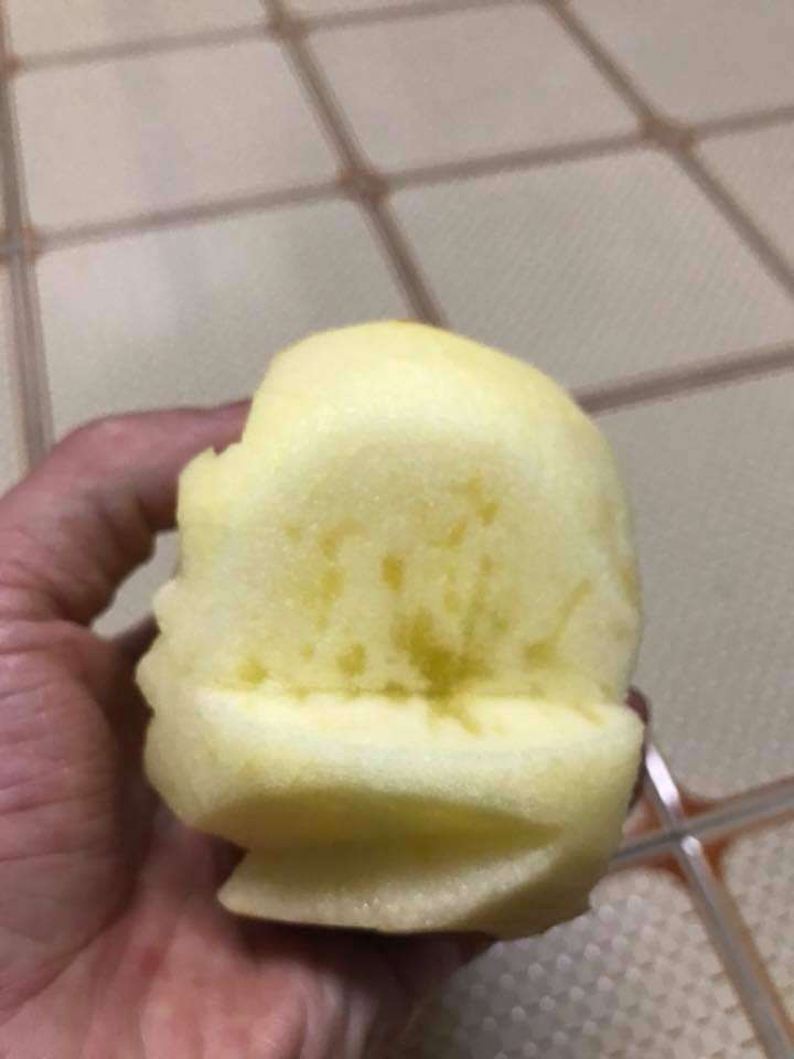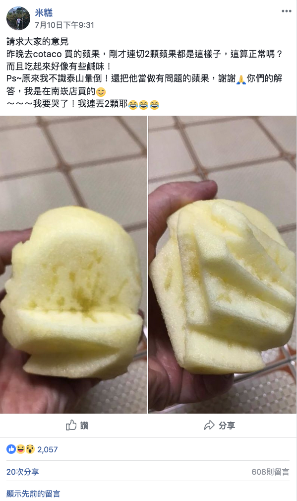 2018年07月13日前幾天,一名網友從好市多(Costco)南崁店買了幾顆蘋果。他削皮切開後發現果肉上有奇怪的紋路,嚐起來還有鹹味。他以為蘋果壞掉,就丟掉2顆,忍不住好奇到臉書社團發問,網友們看到後表示:「極品!賺到了!」