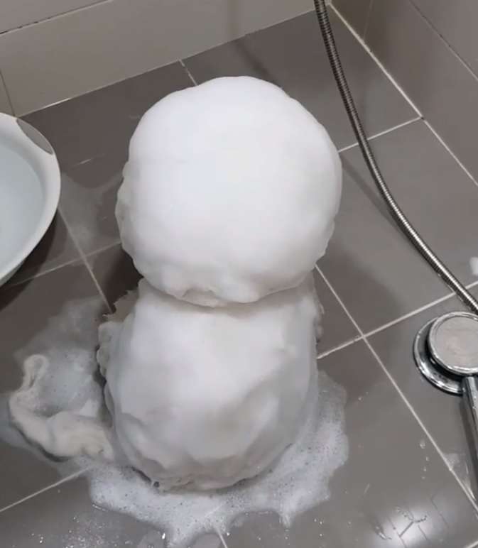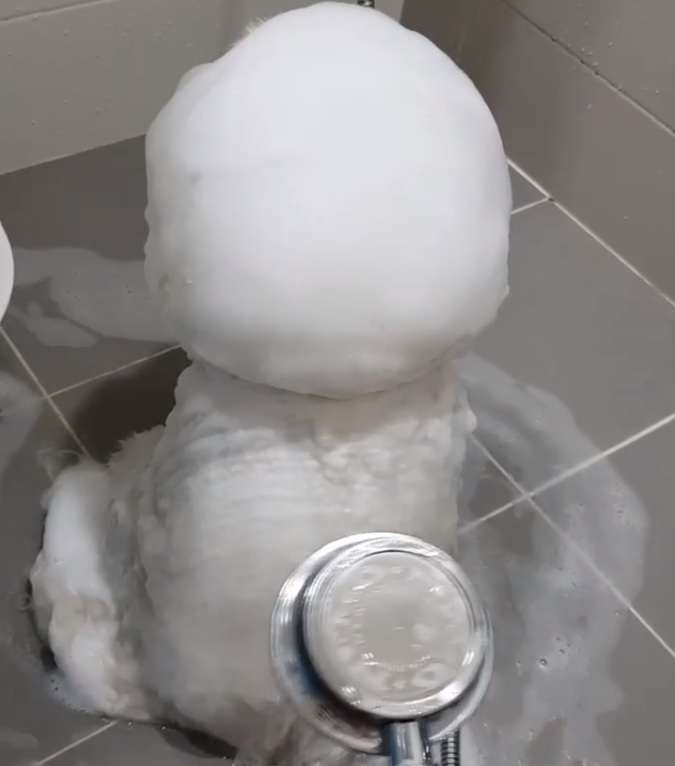 ▼影片中的狗狗背對主人坐著,任由主人把自己變成雪球。牠的大頭被泡泡弄得圓圓的,看起來超可愛。洗澡過程中,狗狗還打了個盹,頭稍微晃了一下。