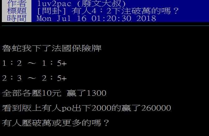 ▼日前有網友在《PTT》的八卦版發文詢問,有沒有人下注法國以4:2獲勝的金額是破萬的,引來了許多網友紛紛在留言處分享手上彩券。