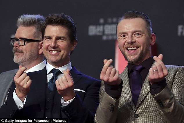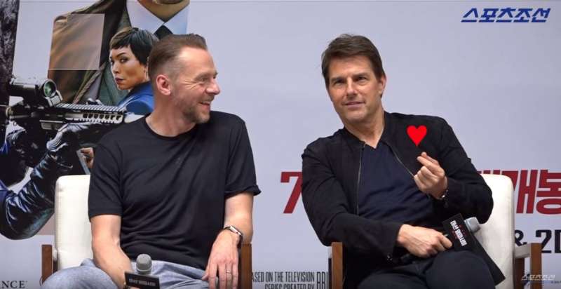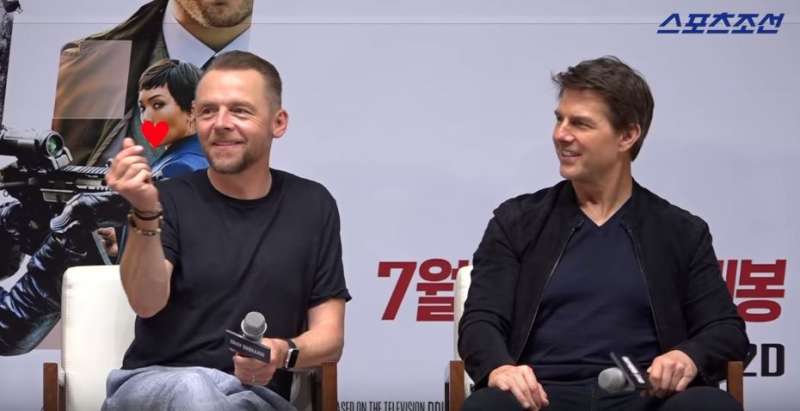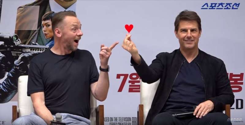 ▼​發布會現場,賽門·佩格首先用手指比愛心。阿湯哥看到後很好奇,立刻向他討教。
