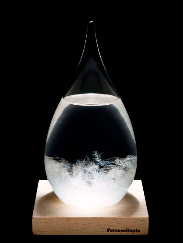 ▼氣象球以天氣試管的原理製做成玻璃球狀,這個玻璃球是把樟腦和食用酒精混合,密封後的物質會隨天氣變化而改變結晶的形狀。據說19世紀時曾被航海人員廣泛使用,作為天氣預測器。從其結晶的形狀可推測出數天後的天氣和雷雨等情況,真是太神奇了!