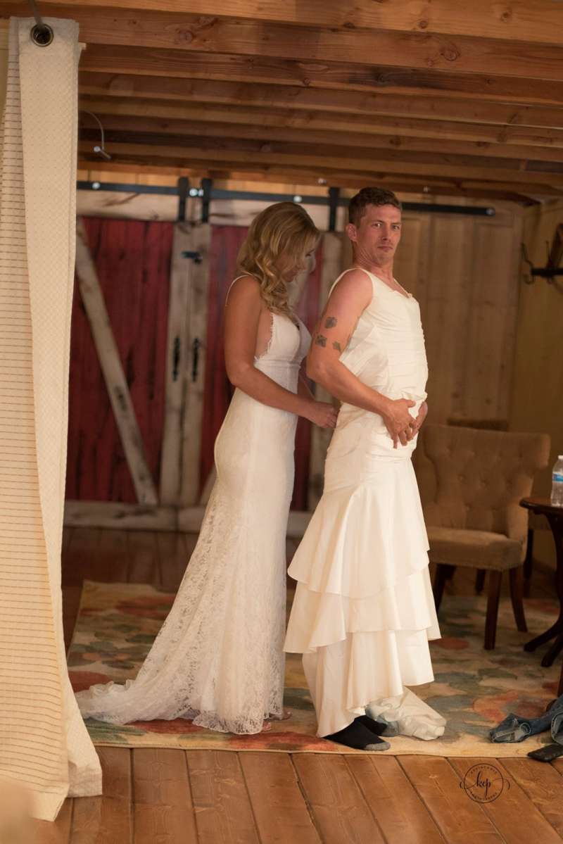 ▼海蒂手上剛好有一件朋友穿過的舊婚紗,於是她讓埃里克穿上這件拖地長裙,不過因為婚紗的尺碼太小,背後的拉鏈無法拉上,讓海蒂在為哥哥穿衣服時捧腹不已。