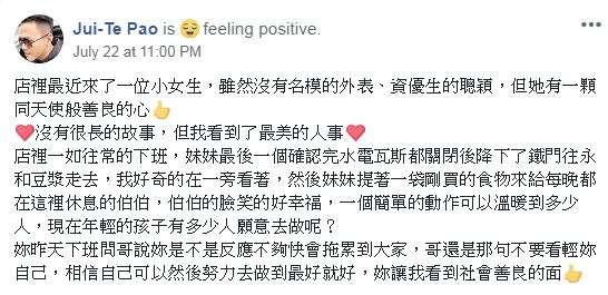 ▼許多網友看完這兩張照片後,紛紛留言表示「好感動…看到那個畫面…眼眶會紅 」、「好棒的妹妹,她一定是個好員工」、「這不是員工,是天使!」以下是老闆在臉書《爆廢公社公開版》的全文: