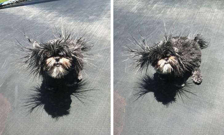▼把狗狗放在彈翻床上,3秒後牠的毛都飛起來了。