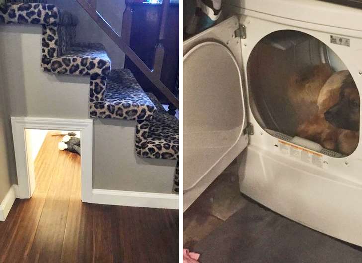 ▼去年時主人專門在樓梯下為膽小的狗狗做了一個隔音狗窩,讓牠害怕的時候有地方可躲。現在他終於發現,自己的心血白費了。