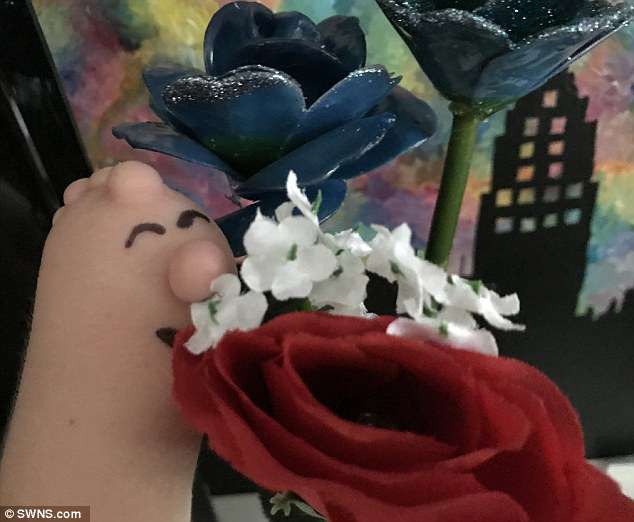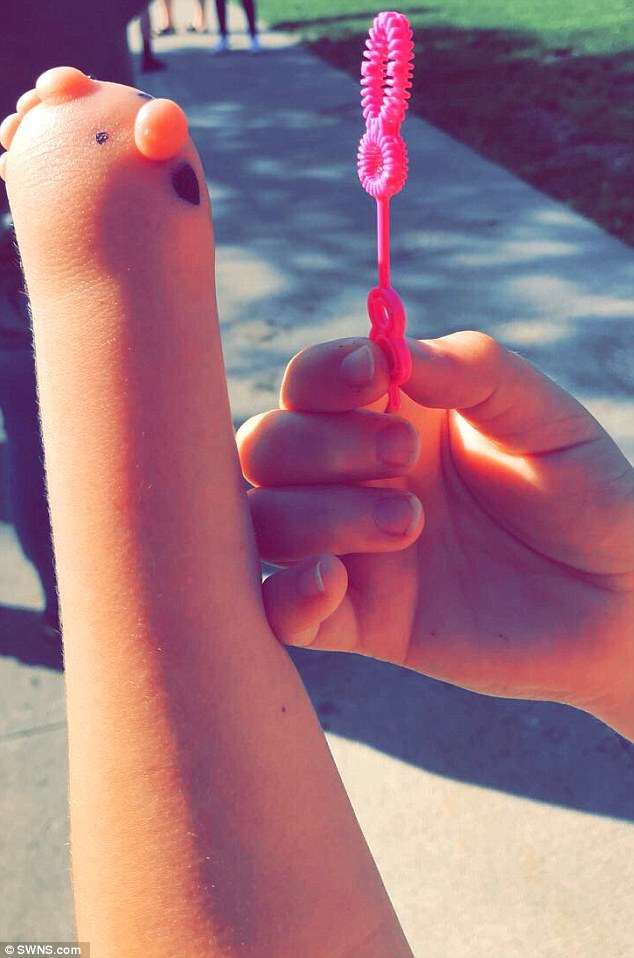 ▼在媽媽的鼓勵下,Haylee把獨特的左手當成了上帝的禮物。一次她突發奇想,拿起畫筆在左手上畫了眼睛、鼻子,再加上那些突起的肉球,她的左手竟然煥發出了新的生機。