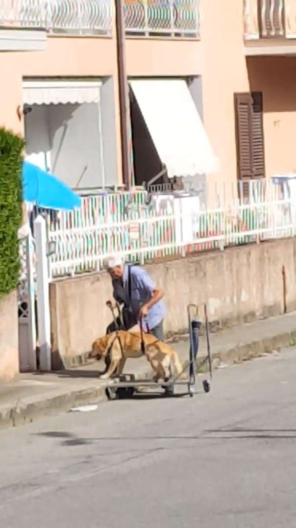 ▼原來日前這名叫做 Sabrina la Grotteria 的義大利女子回到老家維博瓦倫蒂亞市(Vibo Valentia)附近時,目睹了這一幕令人感動的畫面,一名年紀老邁的主人用手推車推著他的狗狗,正在路上曬太陽散步,準備回家。