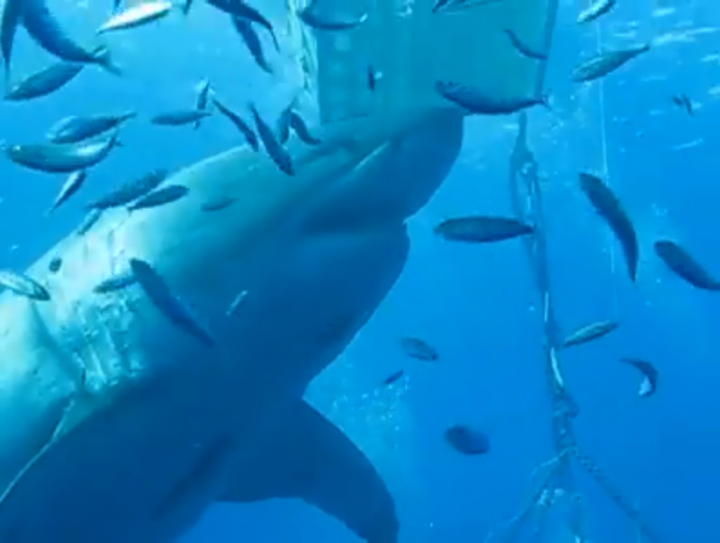 ▼研究人員給這隻大白鯊取名為「Deep Blue」,並認為牠是世界上最大的大白鯊。Deep Blue非常調皮,在研究人員的籠子旁游來游去,一名研究人員還大膽爬到籠子外,與牠近距離接觸。這隻大白鯊已經懷孕相當長一段時間了,所以體型比較大。研究人員認為,牠的年齡至少有50歲。