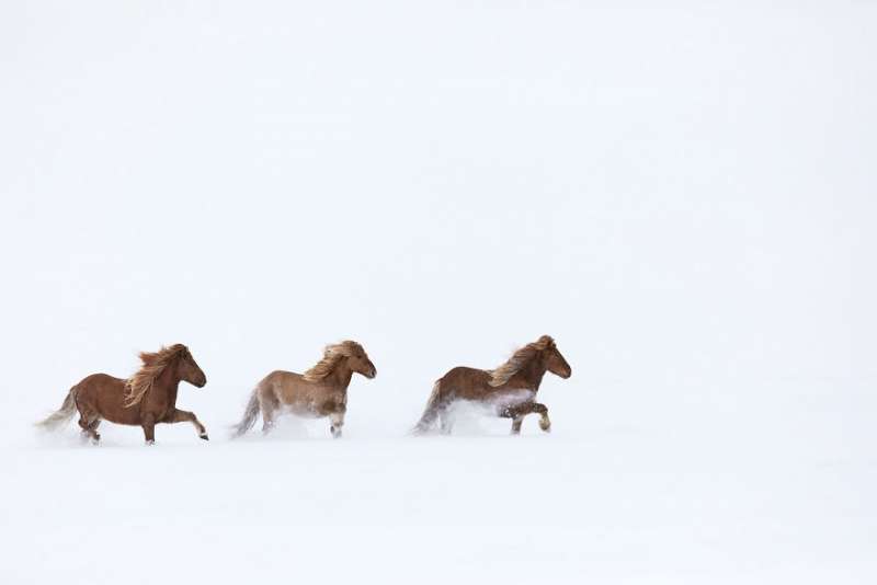 ▼德魯也認為,全彩照片更能呈現馬兒與景觀的對比。在這片白茫茫的大地,奔跑的馬兒實在太美了!