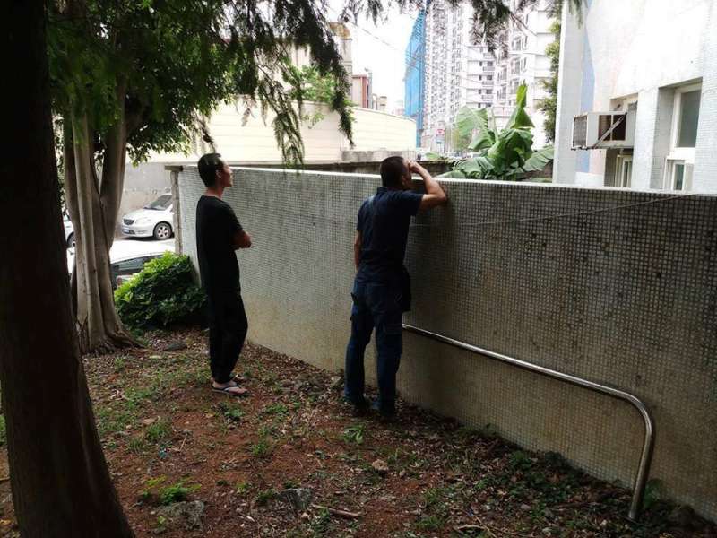 ▼另一名女網友則是分享了兩名黑衣男子在幼稚園牆外伸長脖子往裡面看的照片,原來他們是原po孩子的爸爸和外公!原po搞笑表示:「這不是在辦案也不是擄小孩,這是孩子上學的第一天,外公與爸爸的不捨」。