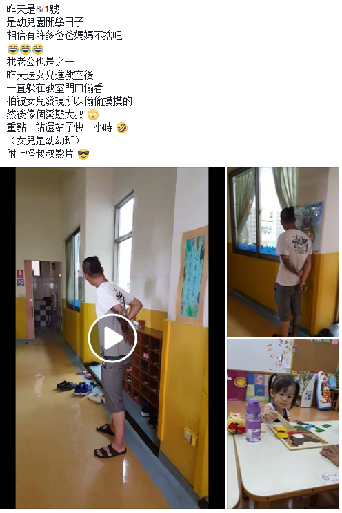 ▼還有一位媽媽網友po出了老公送女兒進教室後不肯離開在教室門口偷看的畫面,吸引了許多網友為他點讃!