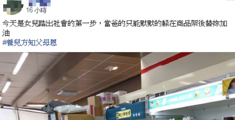 ▼爸爸在爆廢公社PO文:「今天是女兒踏出社會的第一步,當爸的只能默默的躲在商品架後替妳加油」。網友看到都忍不住感動泛淚。