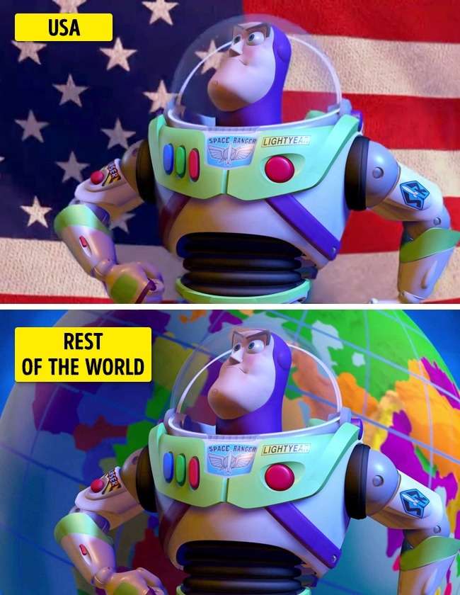 ▼《玩具總動員》(Toy Story):在第二集裡,當巴斯光年在激勵玩具們時,美國版他的背後是飄揚美國國旗,國際版就改成了地球。