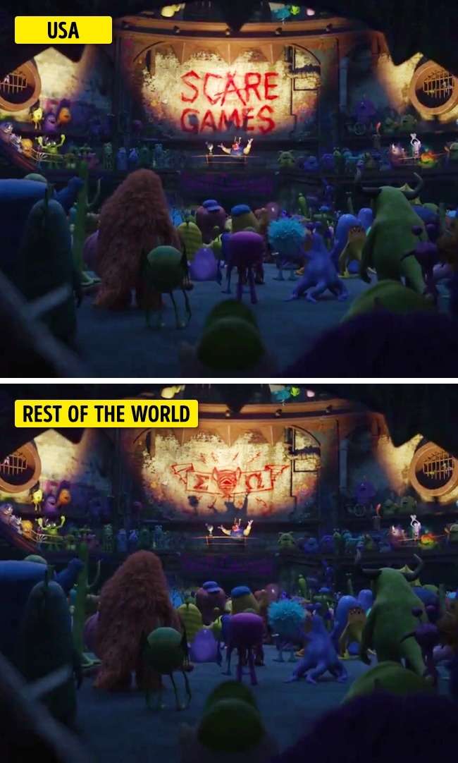 ▼《怪獸大學》:當毛怪撞到藍道時,他砸在臉上的蛋糕拼成了「遜」,不過這同樣在非英語系國家不好表現,所以拿掉了字母。