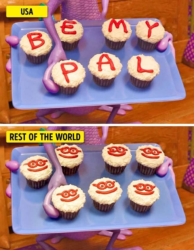 ▼《怪獸大學》(Monsters University):在美國版電影裡,藍道烤了「請當我朋友」(Be my pal)的小蛋糕,不過這個在非英語系國家太難傳遞了,所以改成了笑臉。