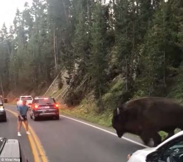 ▼野牛本來不想理會遊客,只想過馬路而已。一名男遊客從車上下來,走近野牛後不停怒吼,還拍胸肌、跺腳挑釁。野牛看到他,轉身發起攻擊,男子差點被頂到。