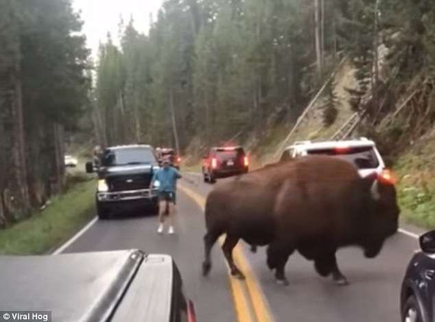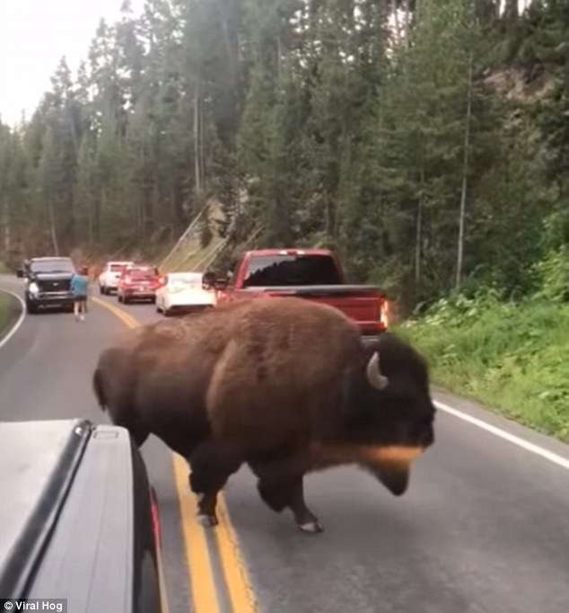 ▼當時遊客Lindsey Jones和家人到黃石國家公園遊玩,他們開車來到某一路段時,路邊出現了一隻907公斤左右的巨型野牛。車流慢下來,還有一些遊客乾脆將車停在路邊,等野牛離開。