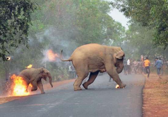 ▼事實上,當地經常有欺負大象的事件傳出,當時攝影師Biplab Hazra拍到這張照片,是周圍人群向一隻成年象及幼年象投擲火球(將餅乾點火)。可以看到牠們腳上還殘留火焰的痕跡。