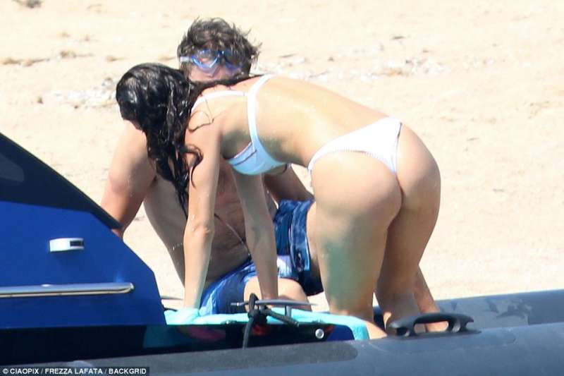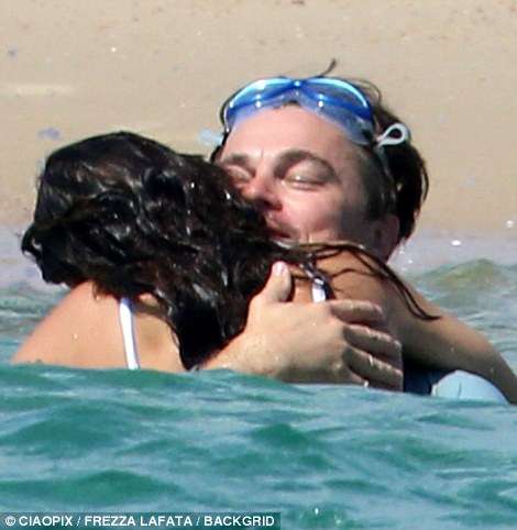 ▼李奧納多穿著一件簡單的淺藍色T搭配海軍游泳短褲,女演員卡米拉則穿著白色比基尼上衣,展現傲人的雙峰。