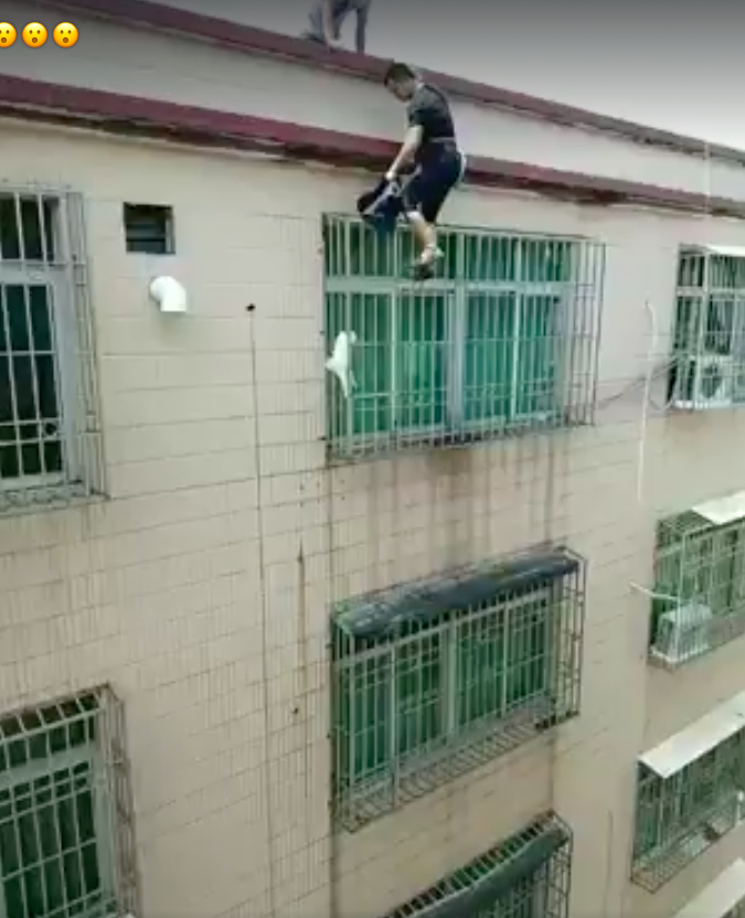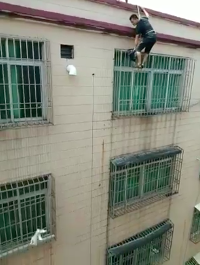 ▼一名男子身上綁著繩子,從頂樓垂吊下來,另一名男子則在頂樓輔助。貓咪蜷縮在鐵窗上,好像非常害怕。