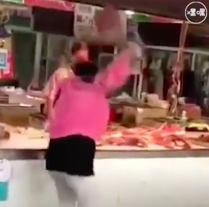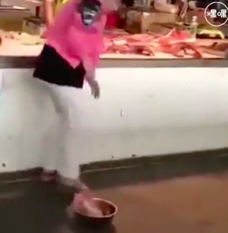 ▼這名穿著紅色上衣、白色褲子的大媽氣勢洶洶走到肉攤前,什麼話都沒說,就抓起一盆肉狠狠摔到了地上。