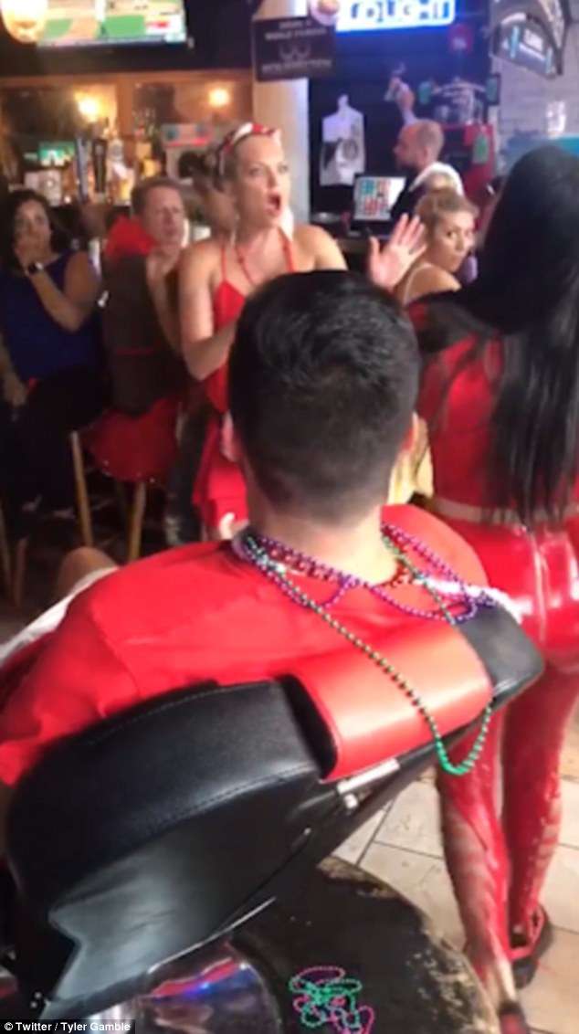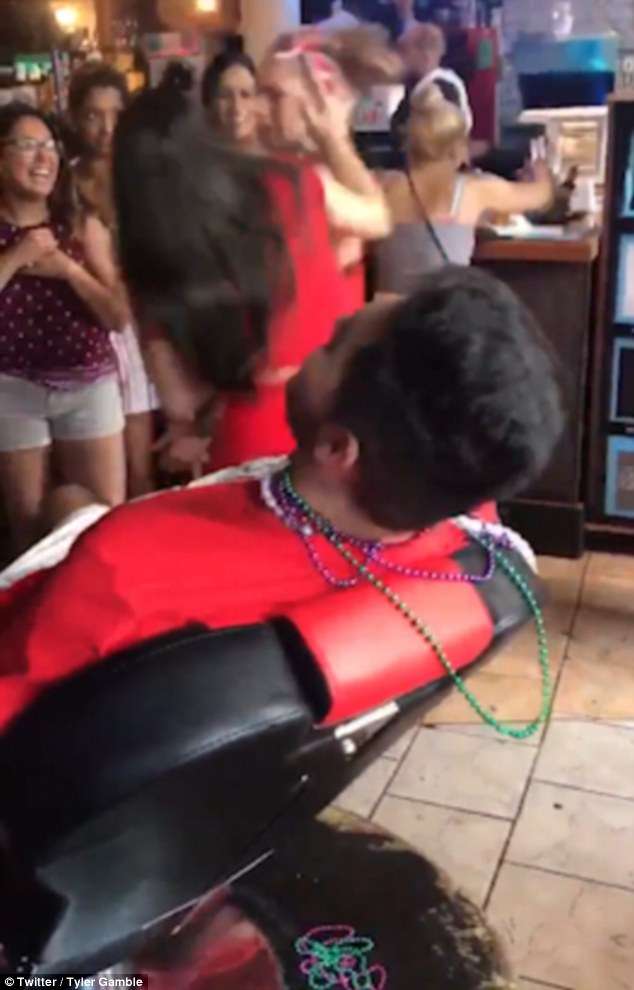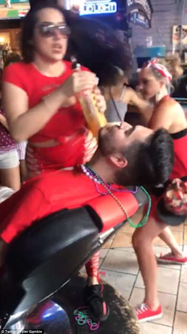 ▼美國一些酒吧有一個很有趣的傳統活動,讓一個人坐在可以旋轉的理髮椅上,由女侍應直接將酒倒進他們的喉嚨後,再用胸部在他們的臉上磨擦。事發當日這名黑髪的女侍應正在執行這項傳統時,一名金髮的女侍應突然衝過來往她的屁股拍了一下。