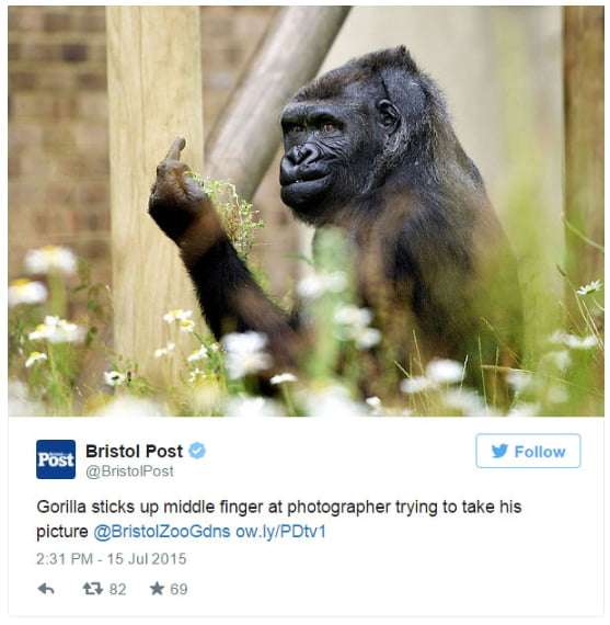 ▼之前一名攝影師給大猩猩拍照時,就被豎中指伺候。