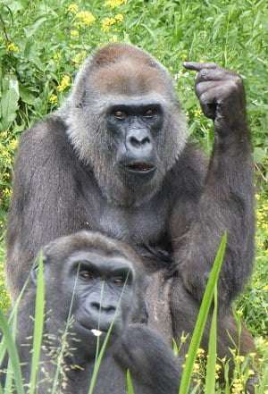 ▼大猩猩似乎明白豎中指的含義,牠們不僅對人類做這樣的動作,還會朝煩人的同類豎中指。