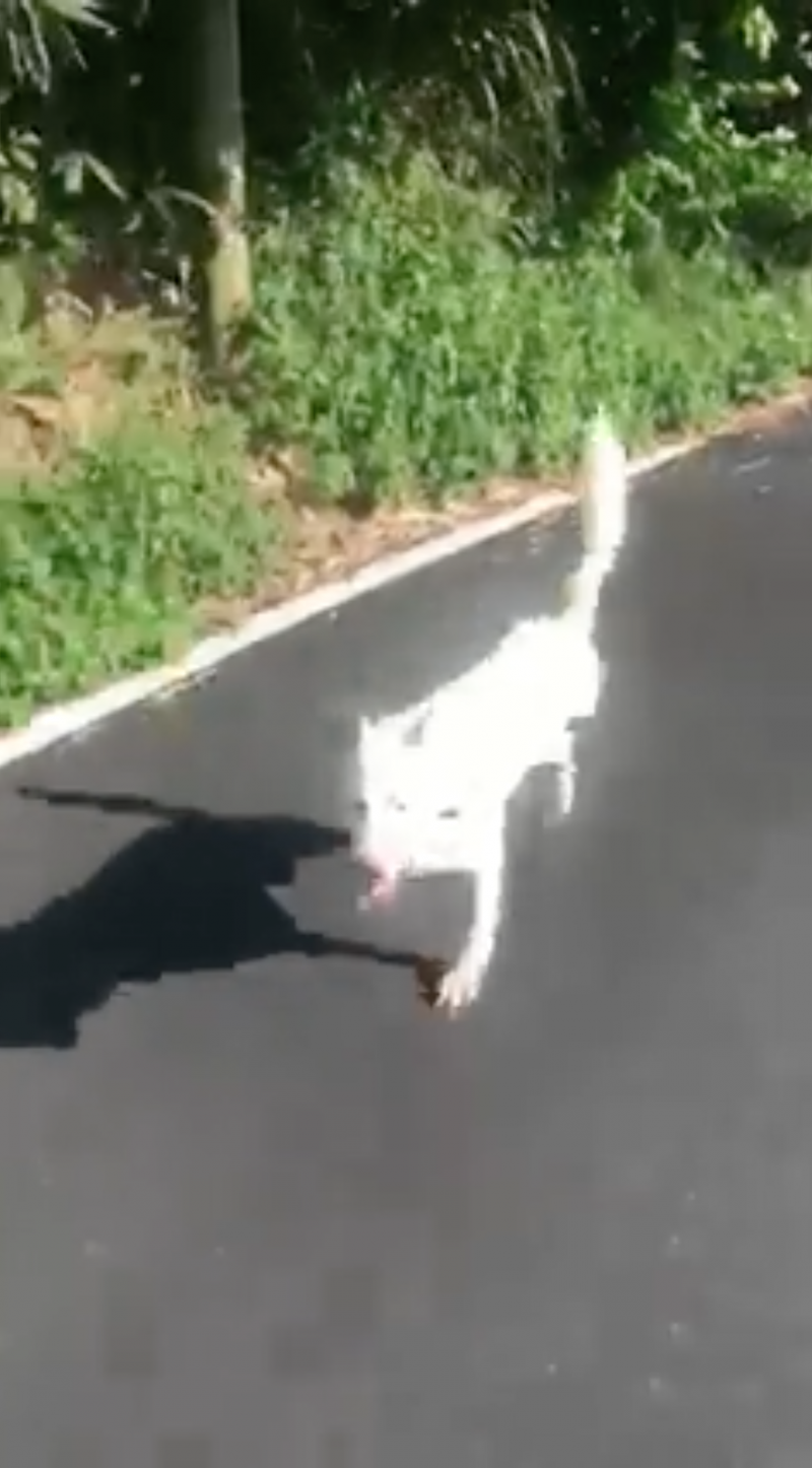 ▼清醒後的白帥帥不習慣失去腳,走路還常常跌倒,頭撞到地板。不過牠還是漸漸學會站穩身體,甚至開始跑步,而白帥帥最喜歡的就是傍晚的散步啦!