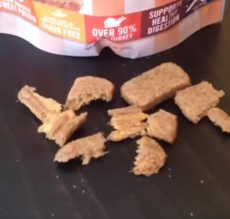 ▼主人先將狗食一塊一塊的丟給愛犬吃。