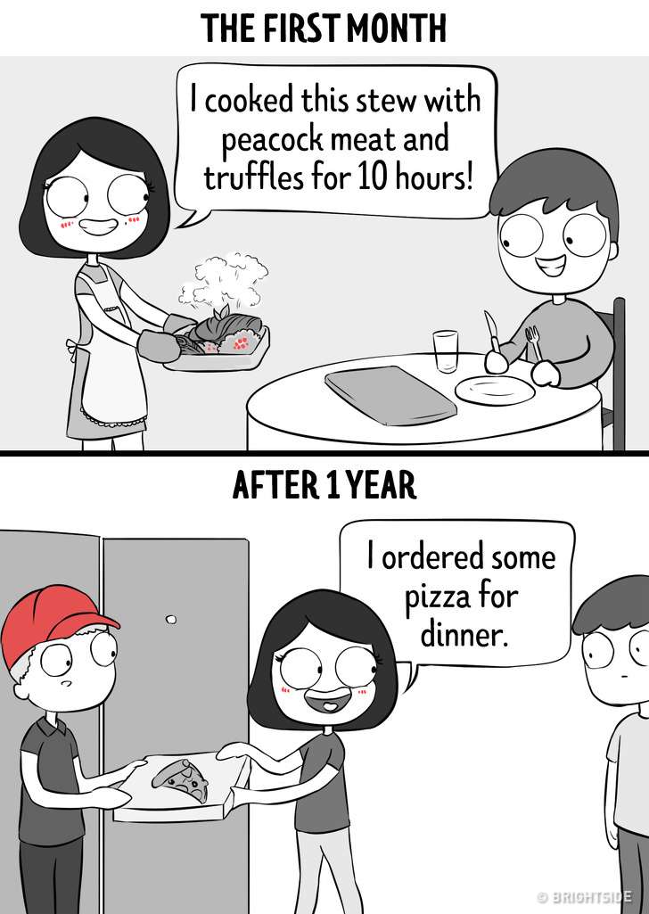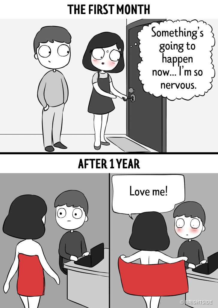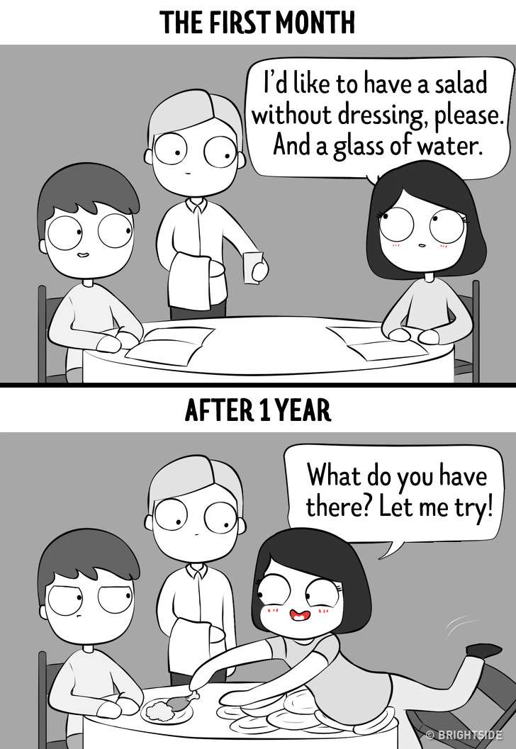 2018年08月21日每段戀情剛開始萌芽時,男女雙方都會想盡辦法表現出自己最好的一面,希望可以讓對方留下最好的印象。可是當兩者交往了一年感情穩定之後,各種真實的本性也會都顯現出來,畢竟要長時間「扮演」另一個人是很累的!國外網站《Brightside》整理出了12個情侶交往首個月和一年後的對比圖,一起來看看你跟另一半是不是也有這樣的狀況!