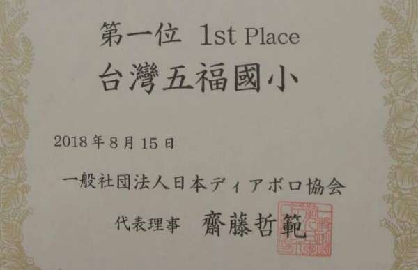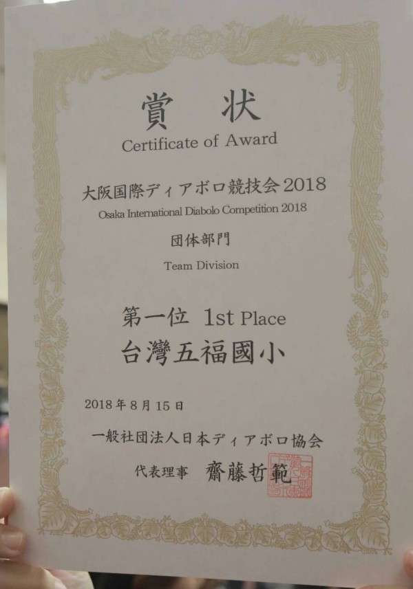2018年08月22日恭喜「高雄市鳳山區五福國小扯鈴隊」為國爭光!他們出國參加「2018日本大阪國際扯鈴大賽」,一舉拿下團體組冠軍、國中生黃顯閎也拿下個人組第三名!參賽的五福國小小將年紀最輕,卻能夠成功打敗職業隊,讓外國人讚嘆!