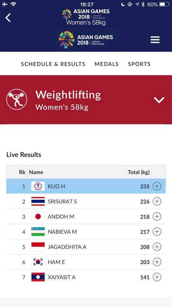 ▼本屆雅加達亞運,郭婞淳以舉重女子58公斤級參賽,抓舉部分,第一次試舉就穩穩舉起100公斤,第二次抓舉103公斤,第三次105公斤,成績穩定領先對手2公斤以上,確定獲得抓舉第一。