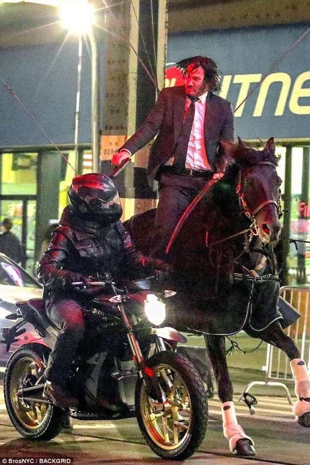▼《捍衛任務3》最近正在紐約的布魯克林和曼哈頓如火如荼的拍攝當中,片場釋出了一張基努李維騎著馬追趕機車騎士的照片,身後還綁滿了鋼絲,令粉絲都對劇中的特技期待不已。